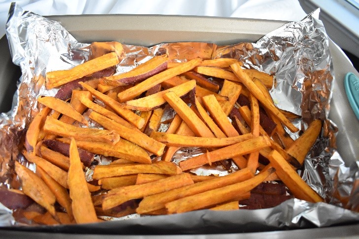 - Place sweet potato “fries” into a bowl and mix with garlic powder, avocado oil, and honey.
