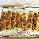 - Slice zucchini length-wise forming the “boat” and scrape out the insides. Bake for approximately 30 minutes.